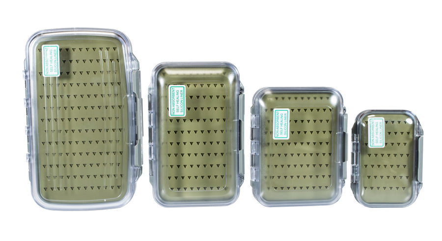 These double sided waterproof fly boxes feature our silicon liner for increased durability and scent free fly storage. Clarified ABS construction with stainless steel hinge pins. Available in 4 sizes. Licensed under US Patent No. 9,913,463